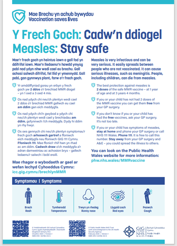 There are now cases of measles in Wales. Cases of measles are increasing across the UK and the uptake of the MMR vaccine has been declining.  If you or your children have not has MMR vaccines please consider it today and contact the surgery.